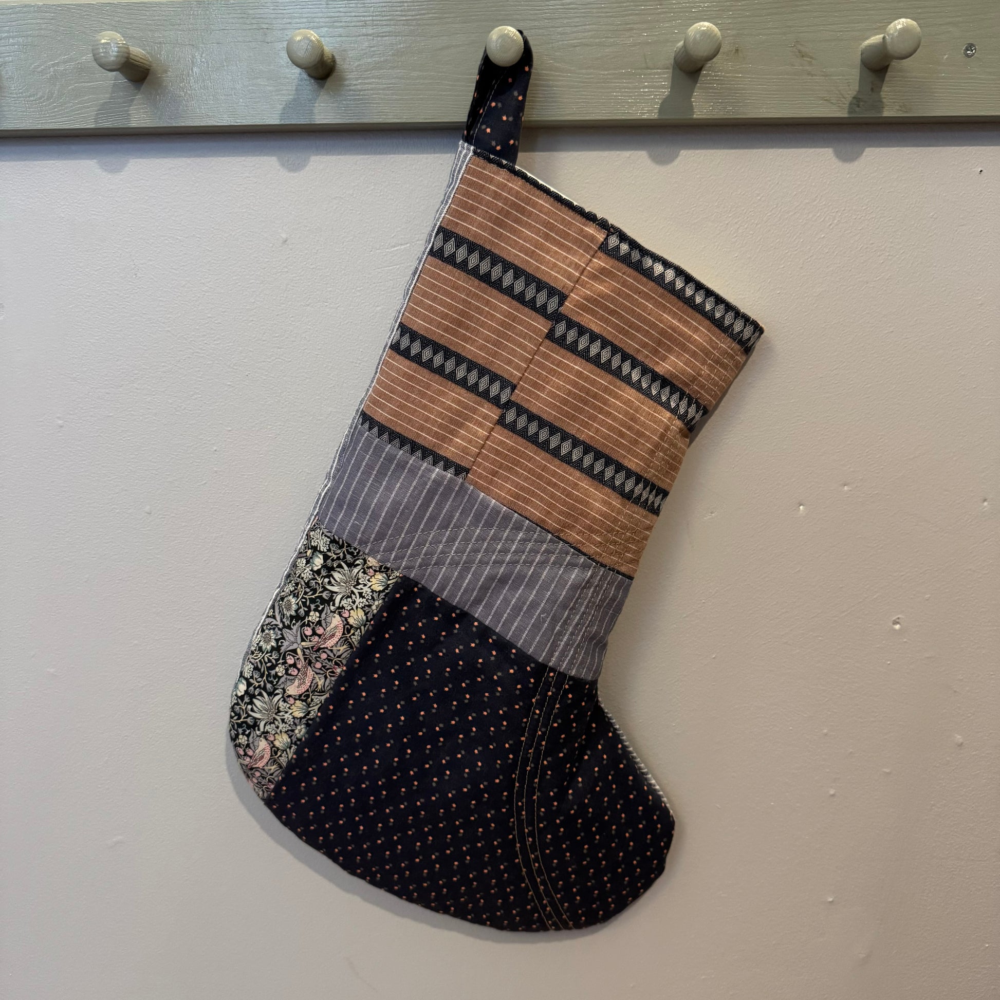 Håndsyet julesok i blå nuancer / rosa nuancer.